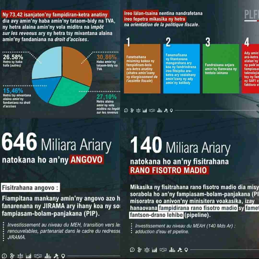 L’ensemble des éléments qui ressortent des visuels du PLFI 2026 traduisent une volonté de moderniser les services publics et de consolider les bases économiques du pays. La priorité accordée à l’énergie témoigne d’un engagement envers la transition énergétique et la modernisation d’une entreprise stratégique comme la JIRAMA. Le secteur de l’eau bénéficie également d’une attention accrue, révélant l’importance de l’accès à l’eau potable dans les politiques publiques actuelles.