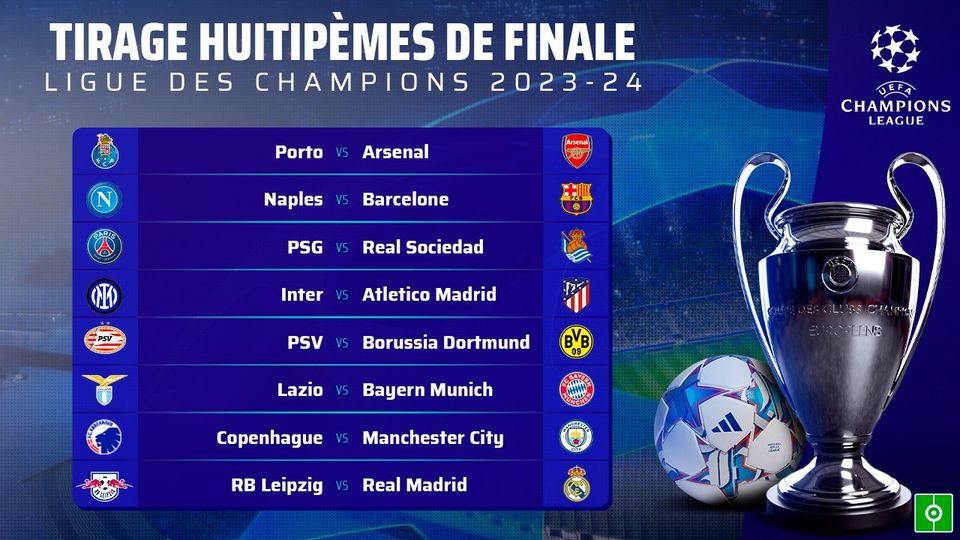 Le FC Barcelone devra relever le défi du SSC Napoli, renouant ainsi avec une rivalité récente. Le FC Porto affrontera Arsenal, qui fait son retour en huitièmes après sept ans d’absence, et la confrontation entre le Borussia Dortmund et le PSV Eindhoven complète les huitièmes de finale.